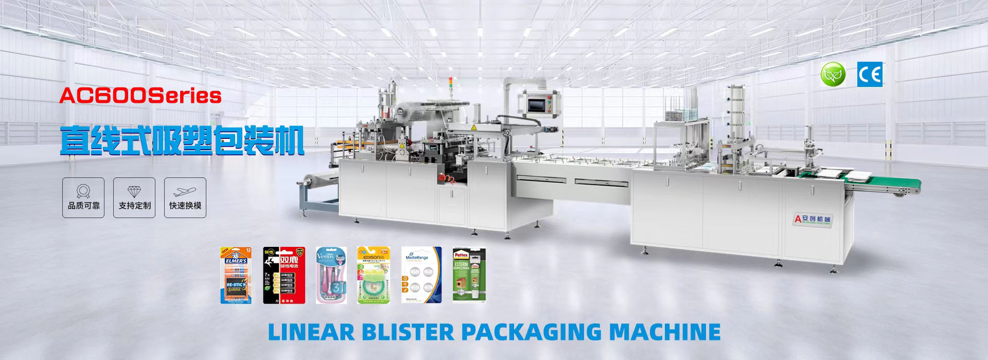 我們專業生產全自動紙塑(吸塑)包裝機,牙刷吸塑包裝機,電池掛卡包裝機,自動裝盒機,紙吸管機等系列產品和多機智能聯動生產線及其相關配套設備。公司集生產、研發、銷售、售后為一體的企業。該產品適用于小五金(堿性電池、紐扣電池、膠水)、文具(卷筆刀、橡皮擦、涂改液、固體膠)、汽摩配(剎車片,雨刮片)、日用品(剃須刀、牙刷、牙線)、化妝品(唇膏,指甲刀,香水)、藥品(紅花油、風油精,)、玩具(小汽車,指尖陀螺,手表)、醫療器械、食品、等行業相關產品的紙塑包裝。
