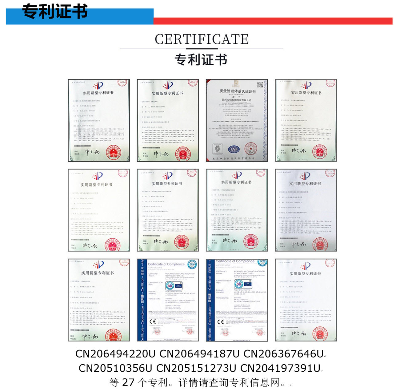我們專業生產全自動紙塑(吸塑)包裝機,牙刷吸塑包裝機,電池掛卡包裝機,吸塑機等系列產品和多機智能聯動生產線及其相關配套設備。公司集生產、研發、銷售、售后為一體的企業。該產品適用于小五金(堿性電池、紐扣電池、膠水)、文具(卷筆刀、橡皮擦、涂改液、固體膠)、汽摩配(剎車片,雨刮片)、日用品(剃須刀、牙刷、牙線)、化妝品(唇膏,指甲刀,香水)、藥品(紅花油、風油精,)、玩具(小汽車,指尖陀螺,手表)、醫療器械、食品、等行業相關產品的紙塑包裝。